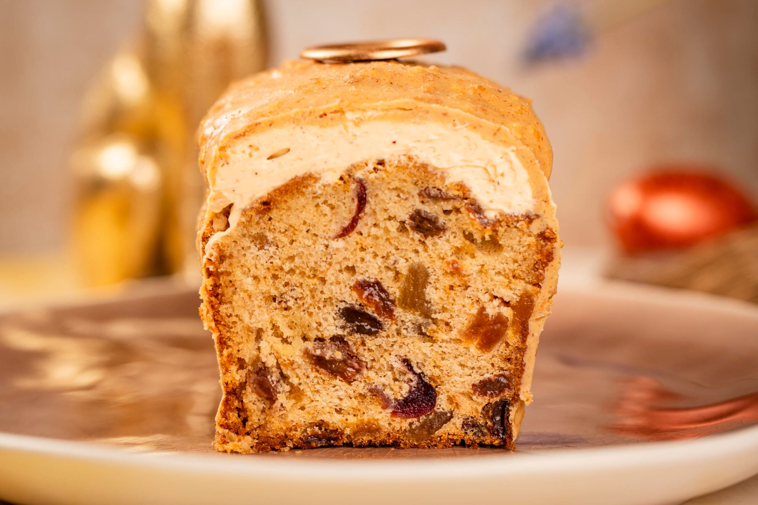 Du liebst diesen Obstkuchen zu Weihnachten, aber er passt auch perfekt auf den Ostertisch! Köstlicher saftiger Obstkuchen mit getrockneten Früchten, getränkt in Rum und Vanillesirup. Oben drauf erwartet dich eine Schicht Mandelcreme mit Amaretto, und das Ganze ist mit einem Überzug auf Basis von Gold-Karamell-Schokolade und französischen Pailleté-Feuilletine-Chips überzogen. MÄRCHEN!
