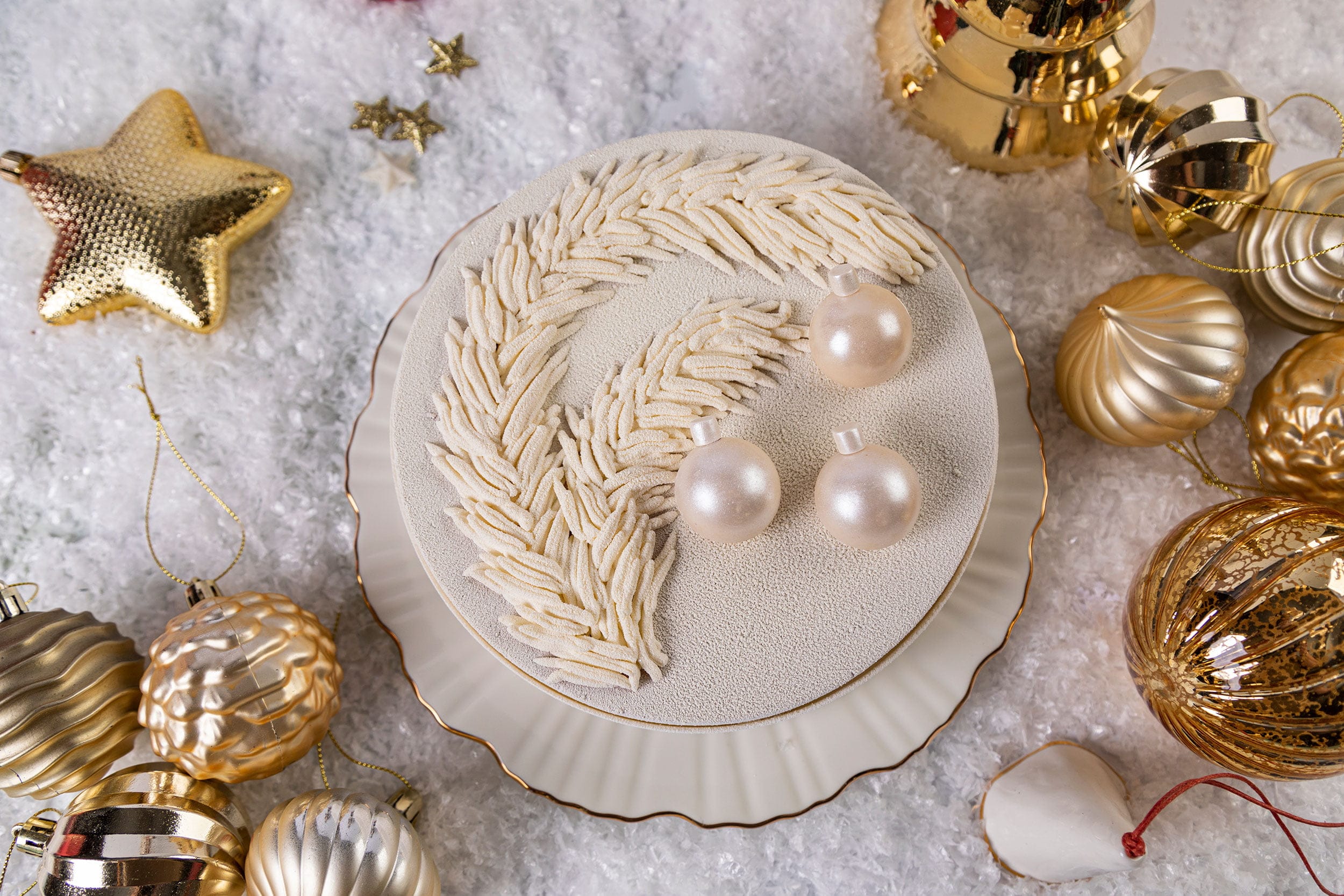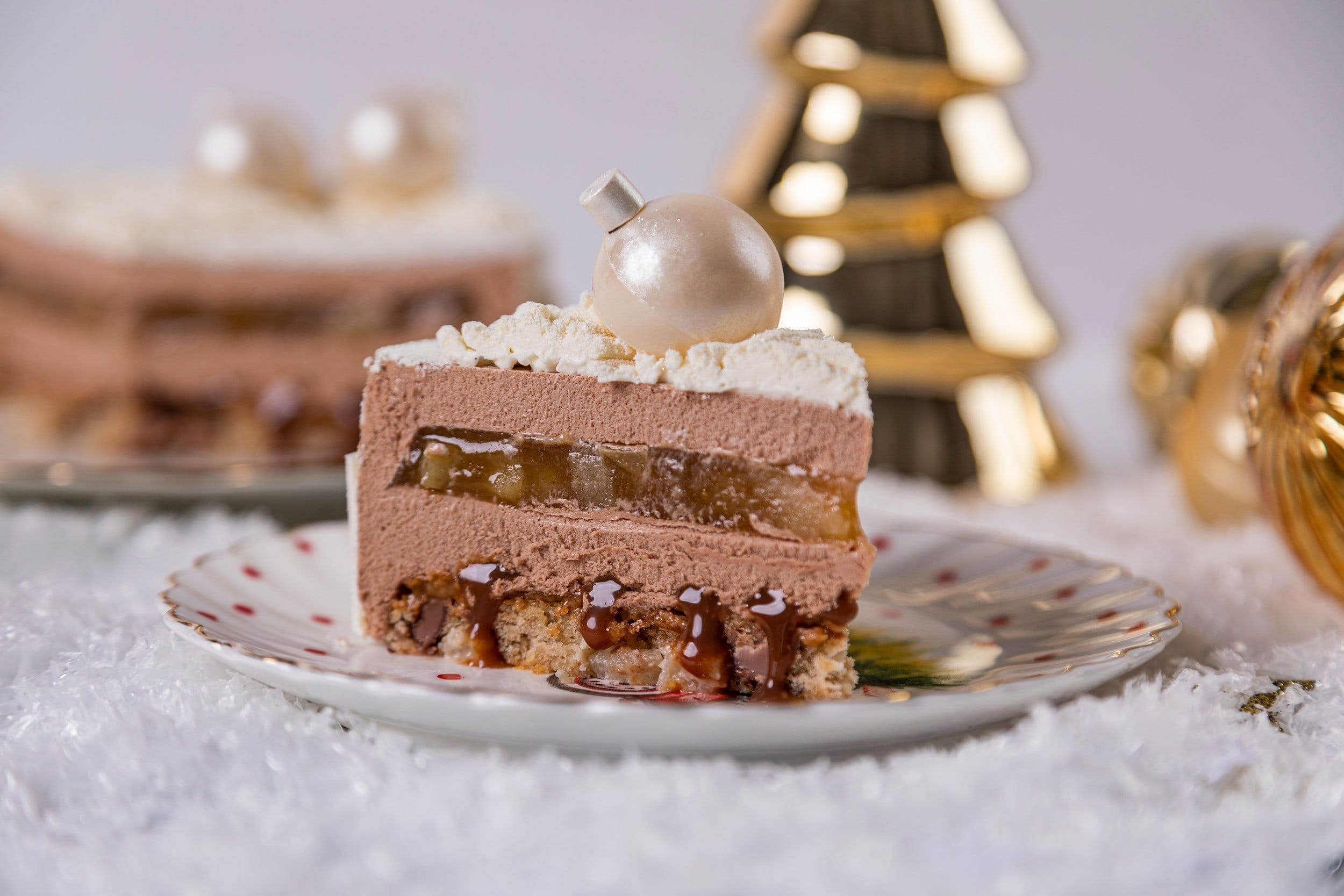 Der Santa Cap 2.0 Kuchen ist einer der Hits unseres diesjährigen Angebots! Er ist erst seit sehr kurzer Zeit bei uns, da er im Dezember 2022 zum ersten Mal in Erscheinung getreten ist. Er wurde nicht nur von unseren Gästen gewürdigt, sondern auch bei unseren internen Verkostungsrunden, bei denen alle vor Freude überwältigt waren. Die Kombination aus samtiger Milchschokoladenmousse mit Birnen und knusprigen Haselnusschips lässt den Santa Cap 2.0 Kuchen den angenehmen und verführerischen Geschmack von Weihnachten spüren, aber auf der anderen Seite möchte man ihn jeden Tag haben. Das Verzieren der Torte ist unser Traum von weißen Weihnachten – voller weißer Flusen. Zusätzlich haben wir es mit Perlenkugeln verziert – natürlich aus weißer Schokolade.