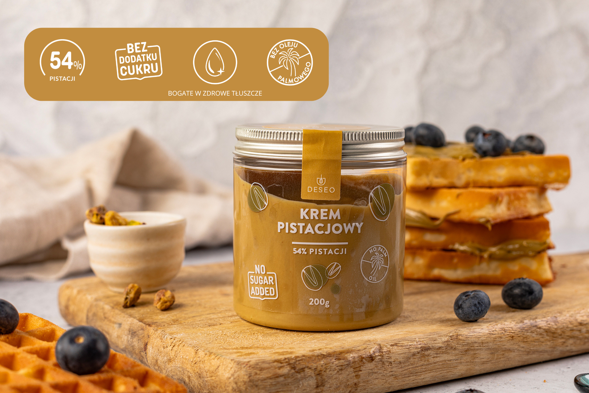 DESEO pistachio cream is not only a sensational taste, but also a pleasantly velvety texture, which makes the cream perfect as an addition to pancakes, waffles, desserts, but also as a filling for croissants, doughnuts or muffins.