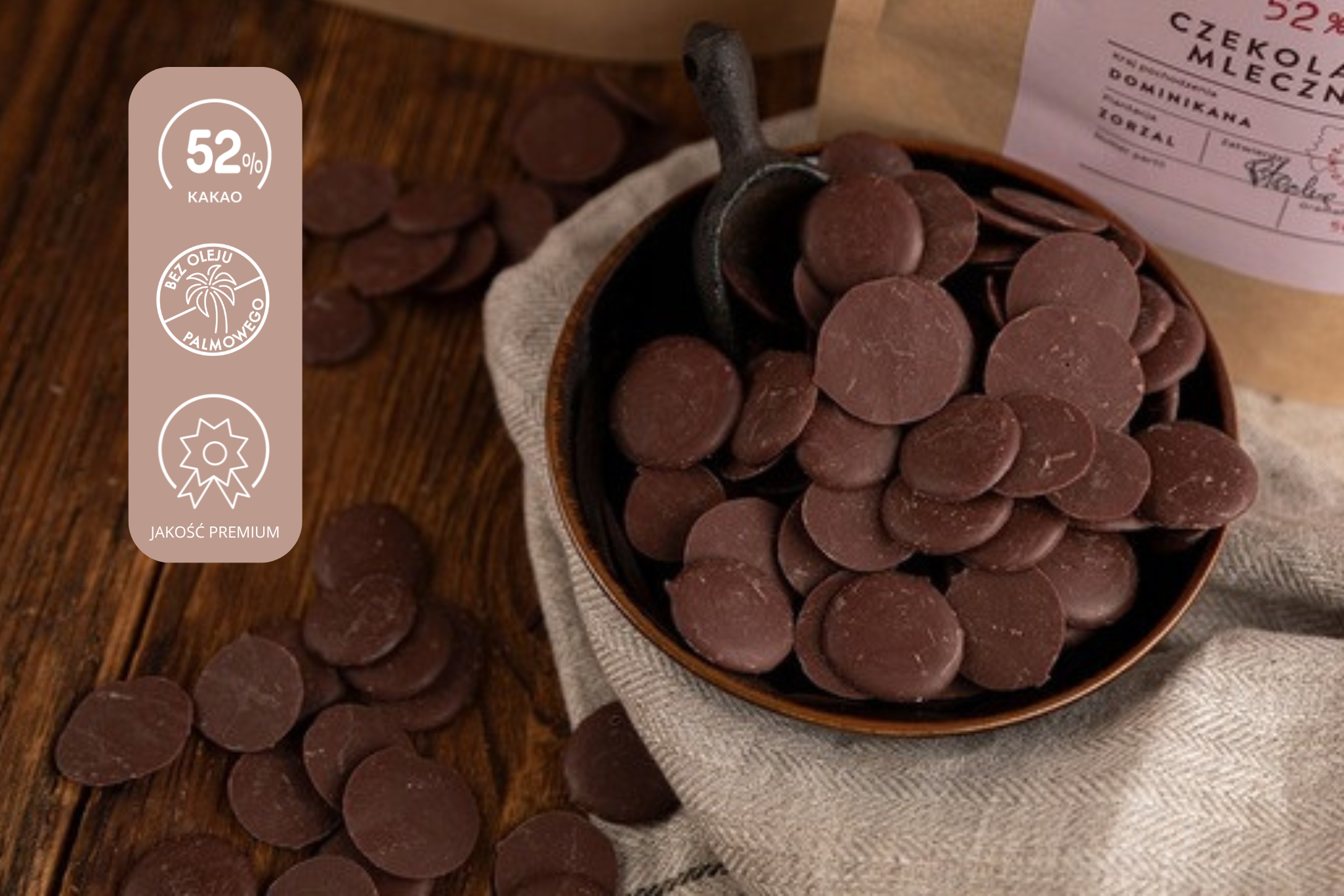 – Dominican Republic milk chocolate drops 52% – with a velvety and creamy consistency, it is characterized by an extremely pleasant, deep chocolate taste.