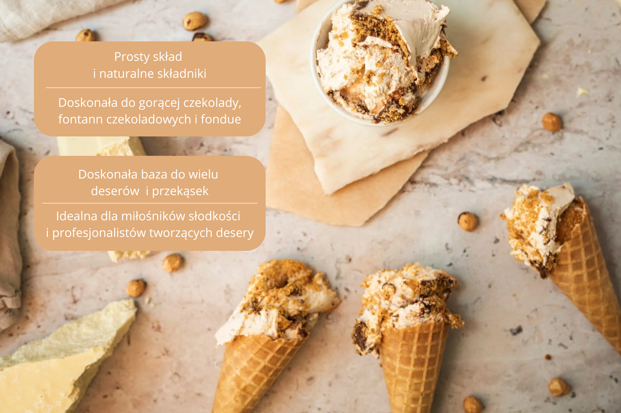 Biała czekolada o intensywnym smaku pełnego mleka i kremowej konsystencji. Jest to idealny wybór nie tylko dla miłośników słodyczy, ale także dla pasjonatów wypieków oraz kulinarnych eksperymentów.