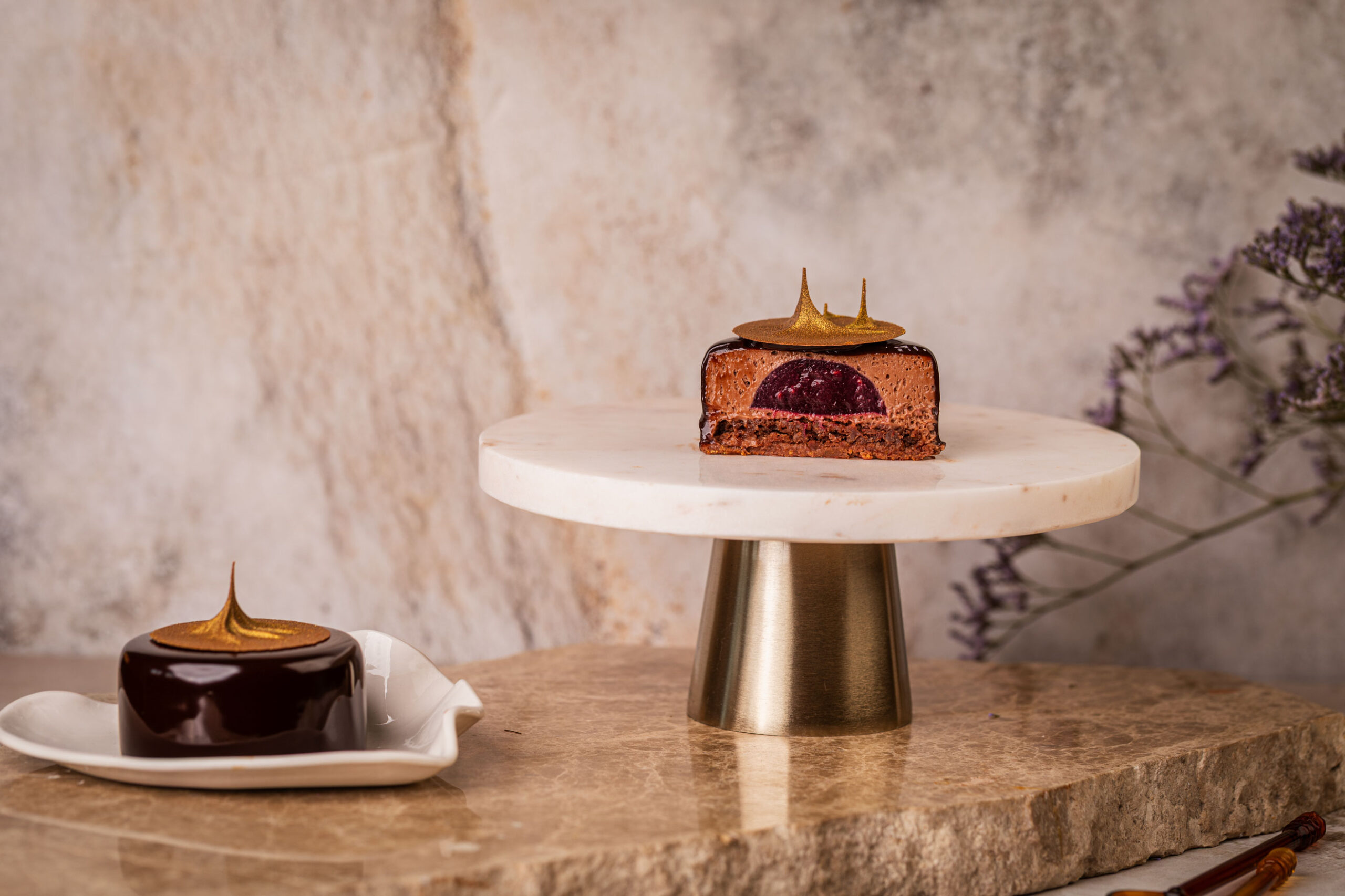 mus z mlecznej czekolady na bazie czekolady bean-to-bar Togo 42% / nadzienie na bazie malin i jeżyn / wilgotne brownie / wytrawna prażynka